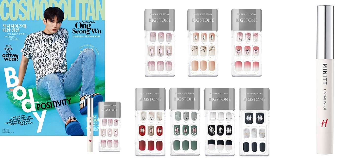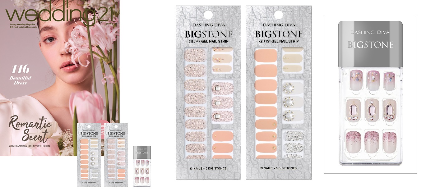 - 브라이트썸씽(14,020원) : 핑크 컬러와 글리터에 스퀘어 크리스탈이 더해져 여성스럽고 빛나는 네일 완성.