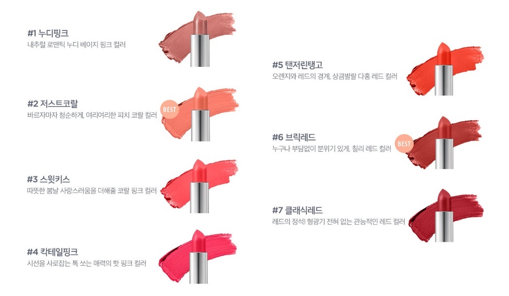 - 01호 클래식 레드 : 강렬한 리얼 레드 컬러가 얼굴에 조명을 켠 듯 환하고 주목 받게 만들어 주는 컬러.